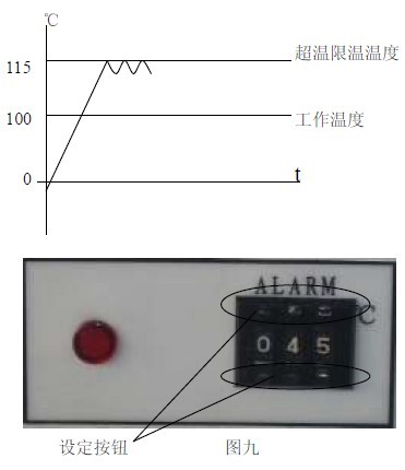 11.2 見圖九,用面板上超溫設定撥盤的+、— 按鈕進行設定所需限溫溫度。